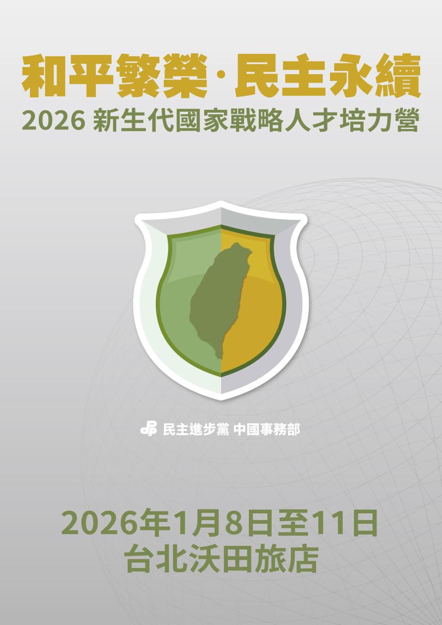 民進黨中國部一年一度「和平繁榮.民主永續 2026新生代國家戰略人才培力營」活動正式開始招生;邀請在國安戰略、 國際外交、兩岸關係、統戰滲透與國際經貿領域的專業級講師進行授課;以及讓學員分組進行政府模擬治理、政經情勢兵棋推演等兩大實作課程。