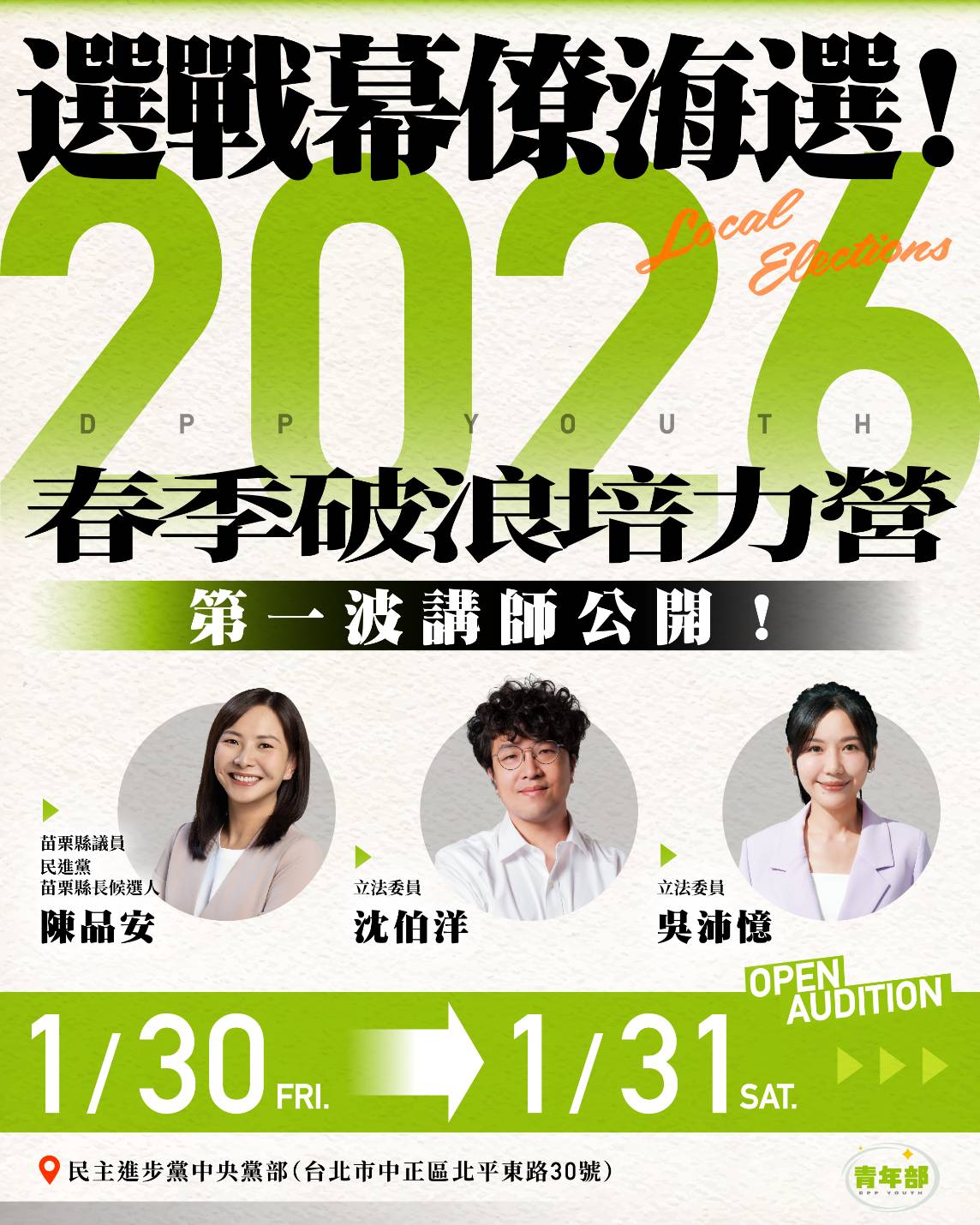 1月底,歡迎報名民進黨青年部「春季破浪培力營」,一起認識選戰幕僚的工作全貌,一同為2026家鄉的未來盡一份心力!