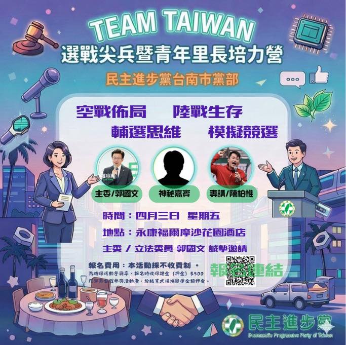 講師陳柏惟、主委郭國文將實際帶領課程進行,結合台南市議員傾囊相授,精彩可期