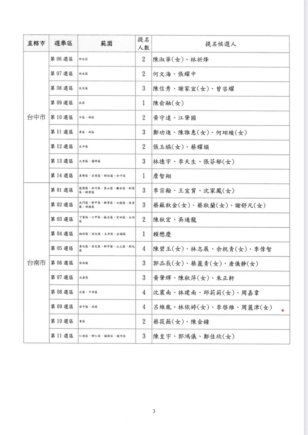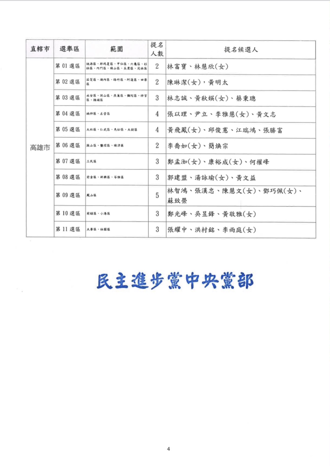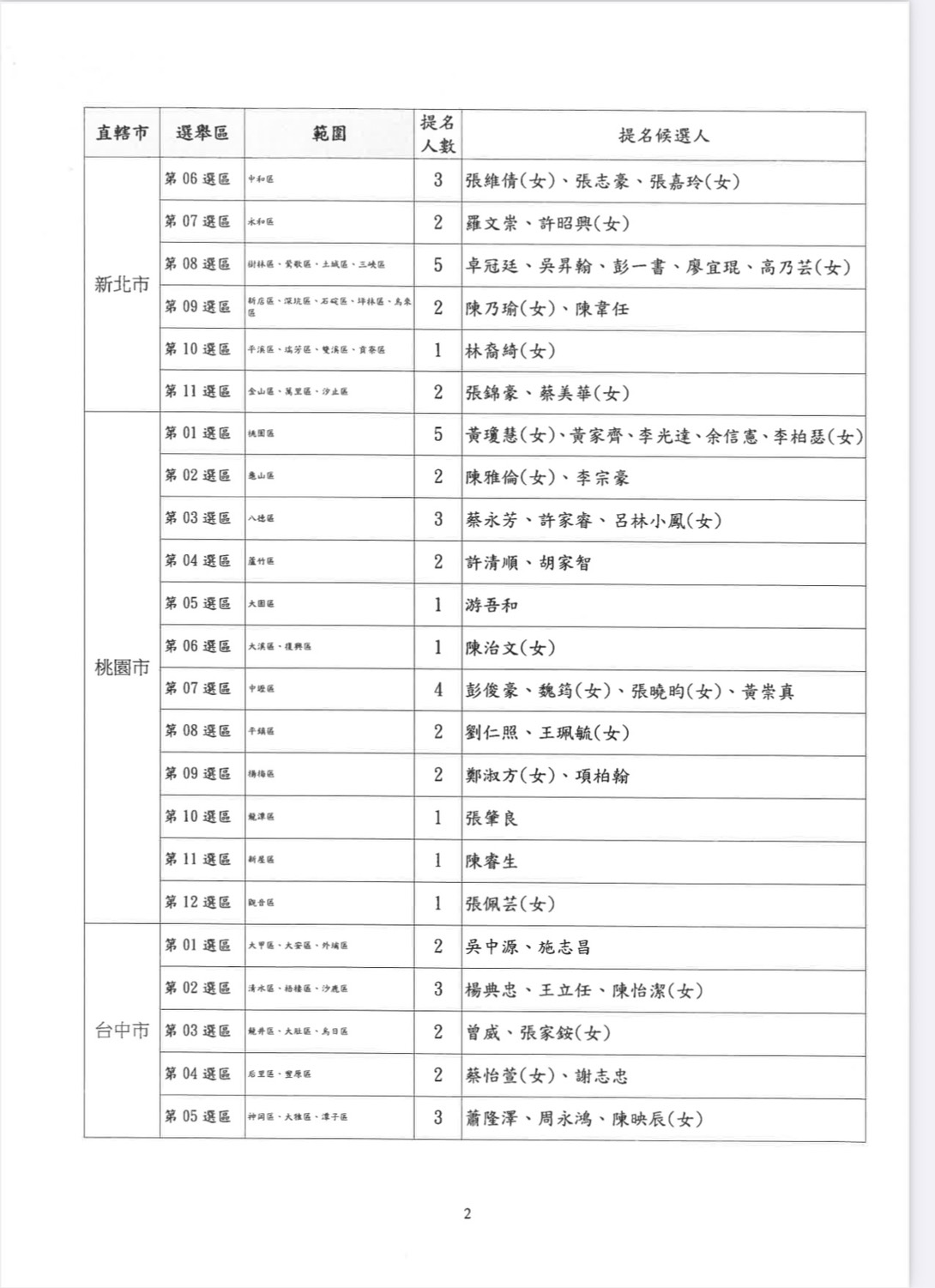 公告本黨2026年直轄市議員提名候選人名單