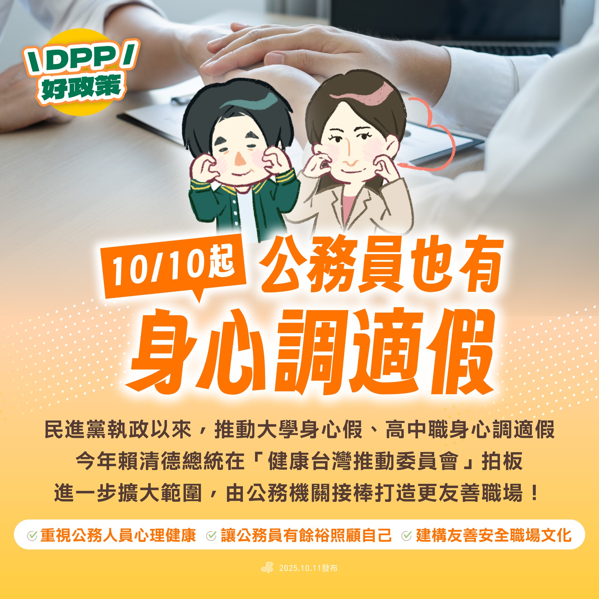 最新的好政策,就是 #公務人員身心調適假,10月10日起正式上路!