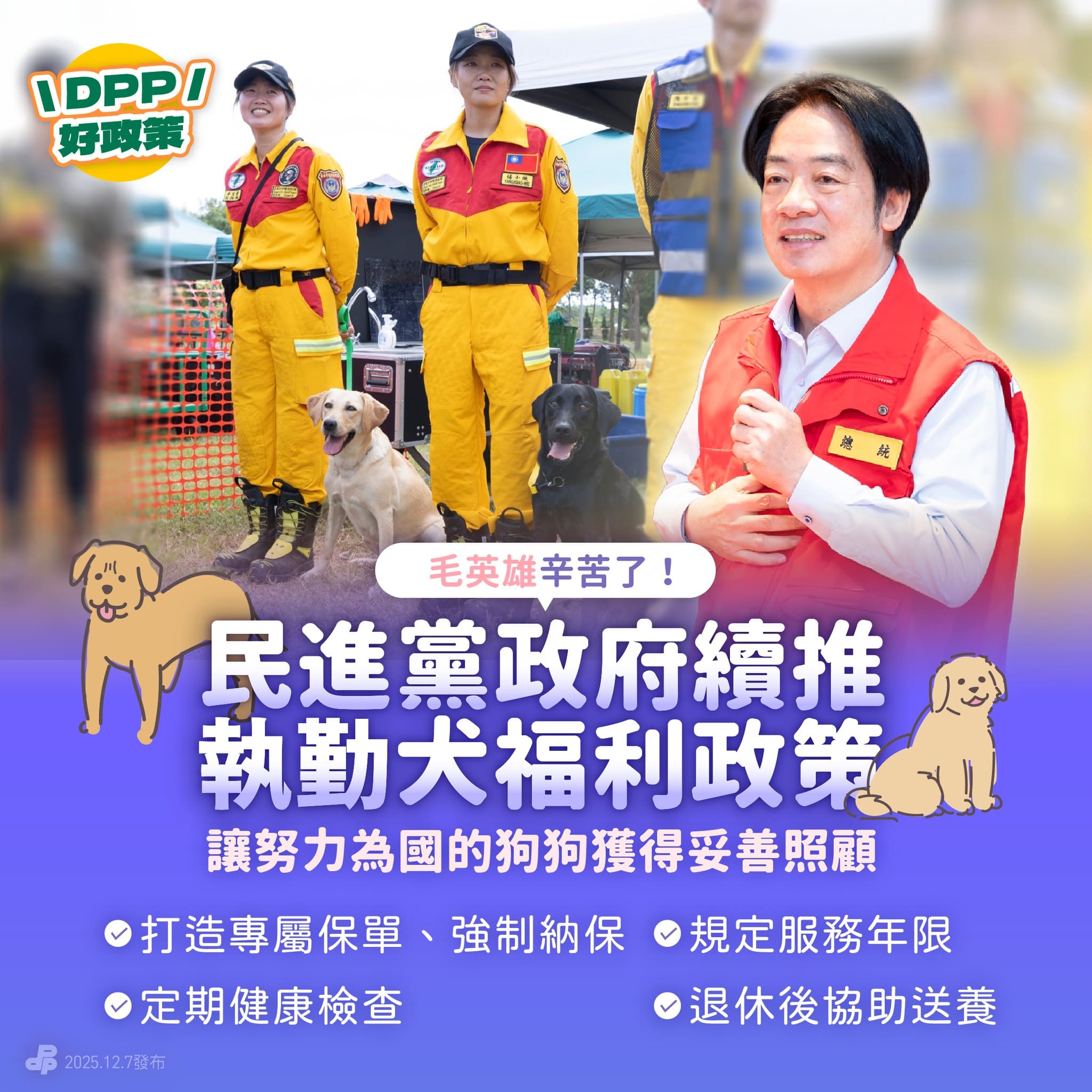 因此,#民進黨政府 近年持續推動 #執勤犬福利政策 ,盼望讓每一位汪汪隊成員都能獲得更周全的照護!