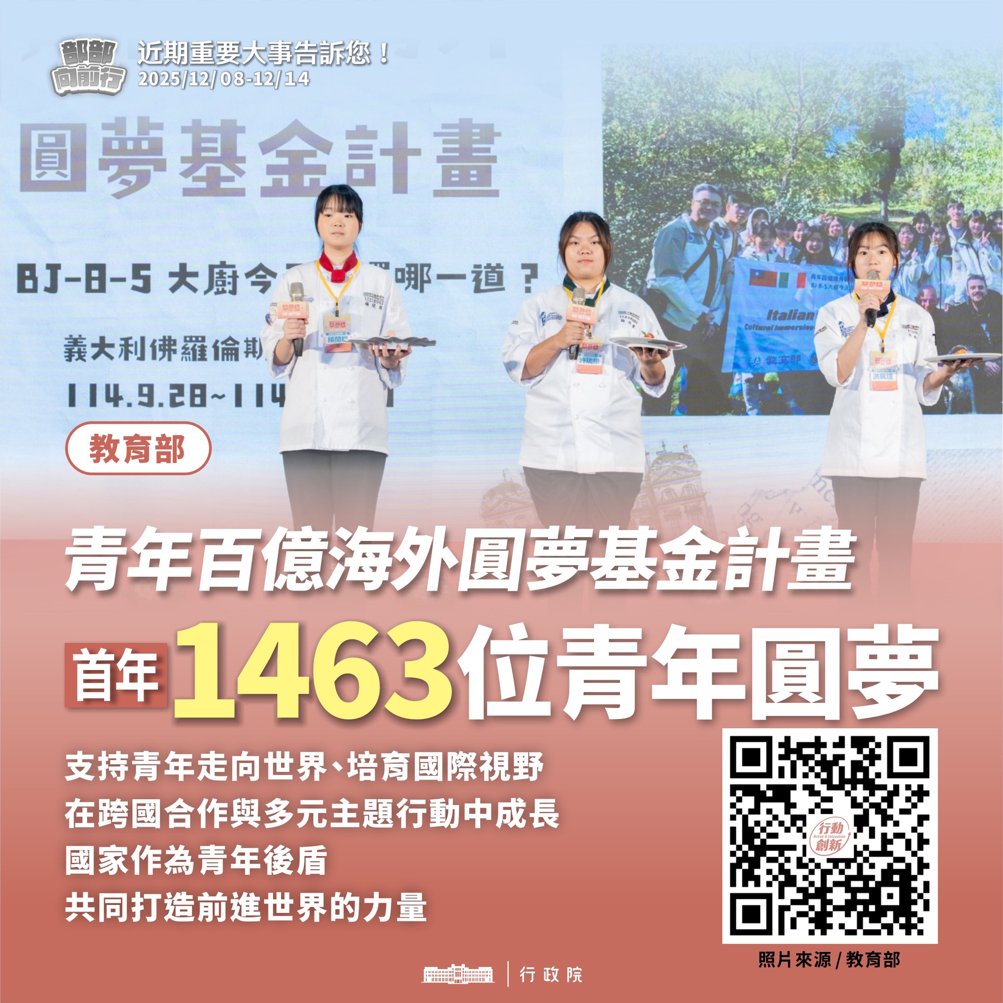 教育部:青年百億海外圓夢基金計畫成果展現,首年助1,463位青年海外圓夢。