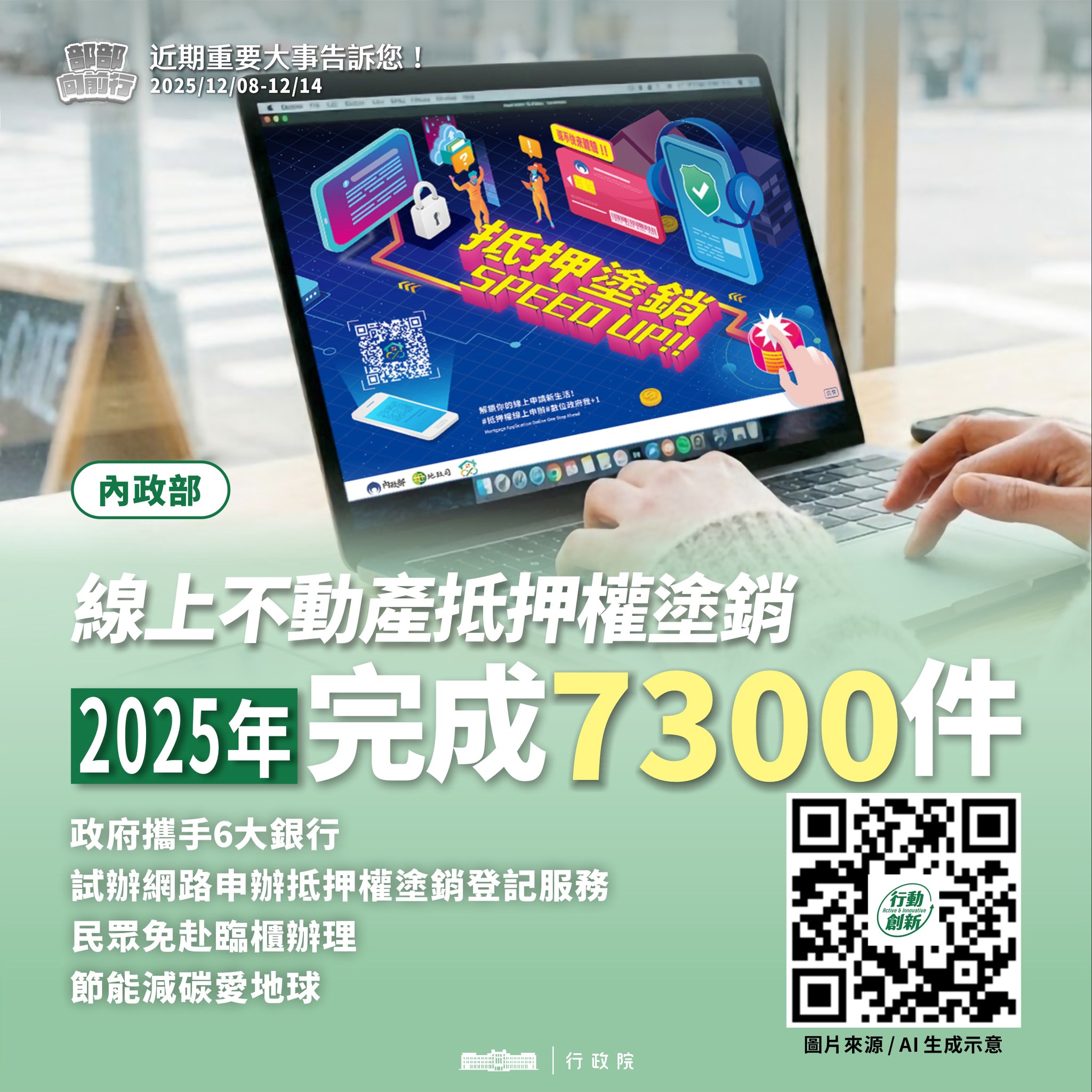 內政部:內政部偕6大銀行推線上不動產抵押權塗銷,114年已完成7,300件。