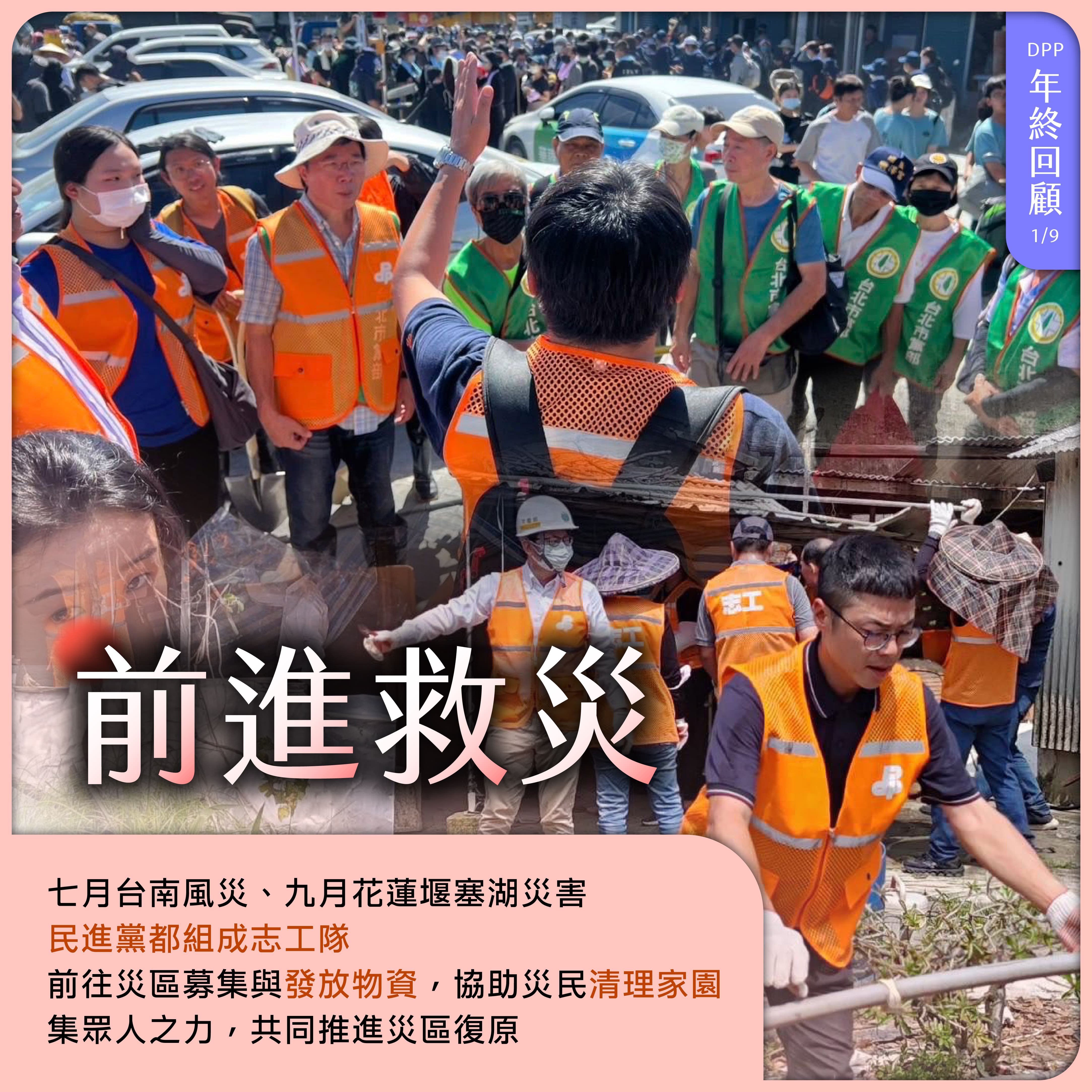 七月台南風災、九月花蓮堰塞湖災害,民進黨都組成志工隊,前往災區募集與發放物資、協助災民清理家園。集眾人之力,共同推進災區復原。