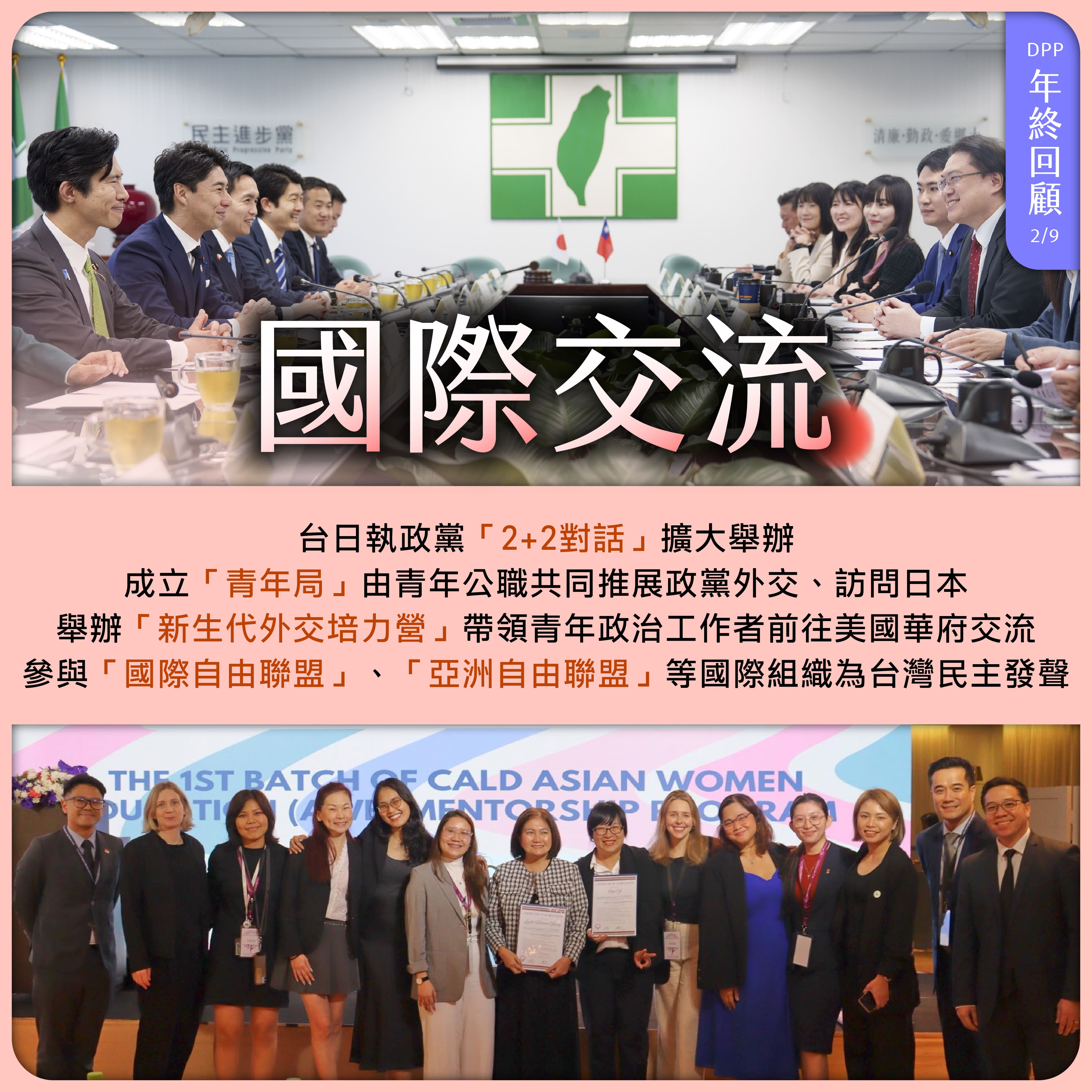 擴大舉辦台日執政黨「2+2對話」,並成立 #民進黨青年局 推展政黨外交;舉辦「新生代外交培力營」前往美國華府交流;參與 #國際自由聯盟(Liberal International, LI)、#亞洲自由聯盟(CALD)等國際組織為台灣民主發聲。