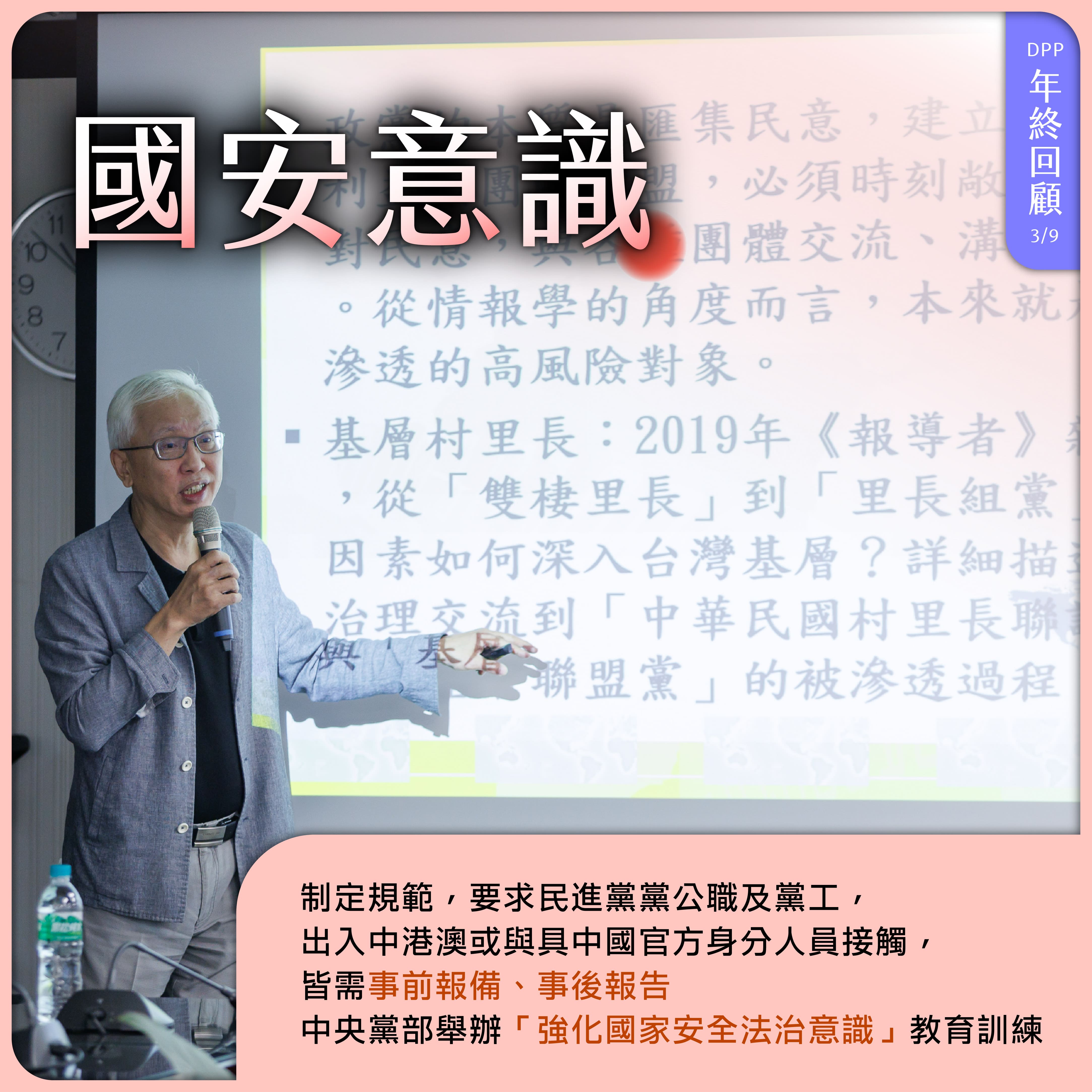 制定規範,要求民進黨黨公職及黨工,出入中港澳或與具中國官方身分人員接觸,皆需事前報備、事後報告,並持續舉辦「強化國家安全法治意識」教育訓練。