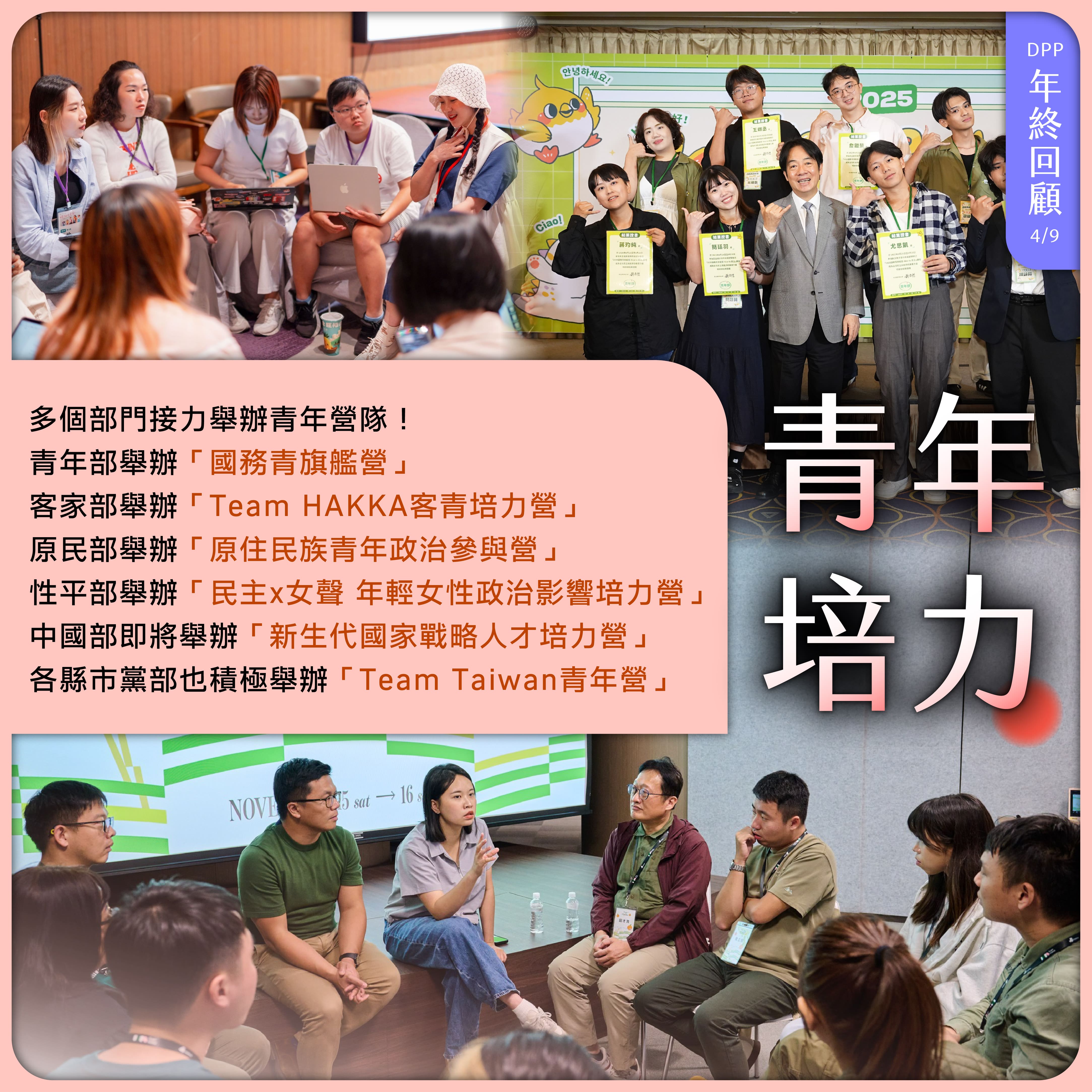 青年部、客家部、原民部、性平部、中國部等多個部門,接力舉辦青年營隊,各縣市黨部也積極舉辦「Team Taiwan青年營」。