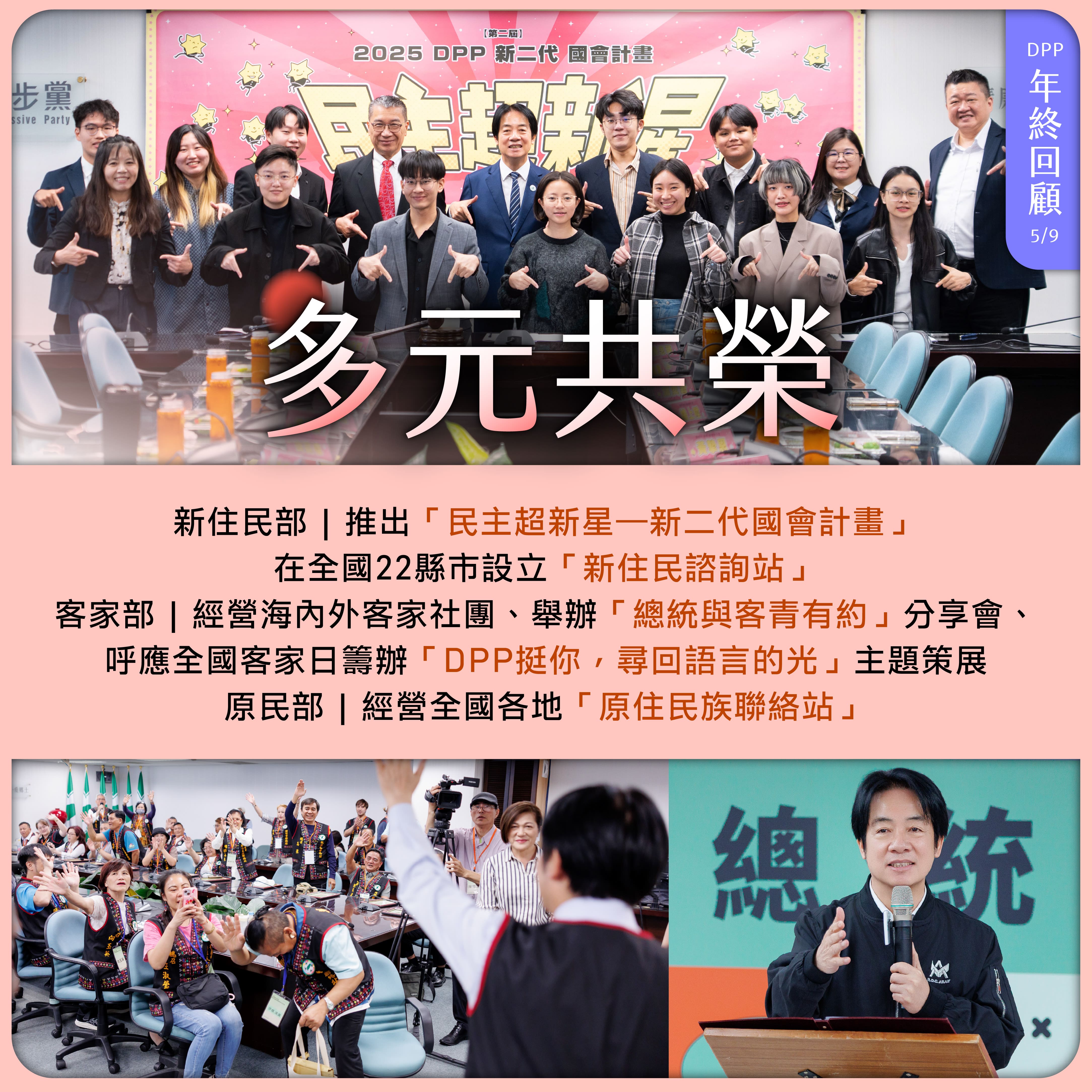 新住民部推出「民主超新星—新二代國會計畫」,並在全國22縣市設立「新住民諮詢站」;客家部持續經營海內外客家社團、舉辦「總統與客青有約」分享會、呼應全國客家日籌辦「DPP挺你,尋回語言的光」主題策展;原民部深耕經營全國各地「原住民族聯絡站」。