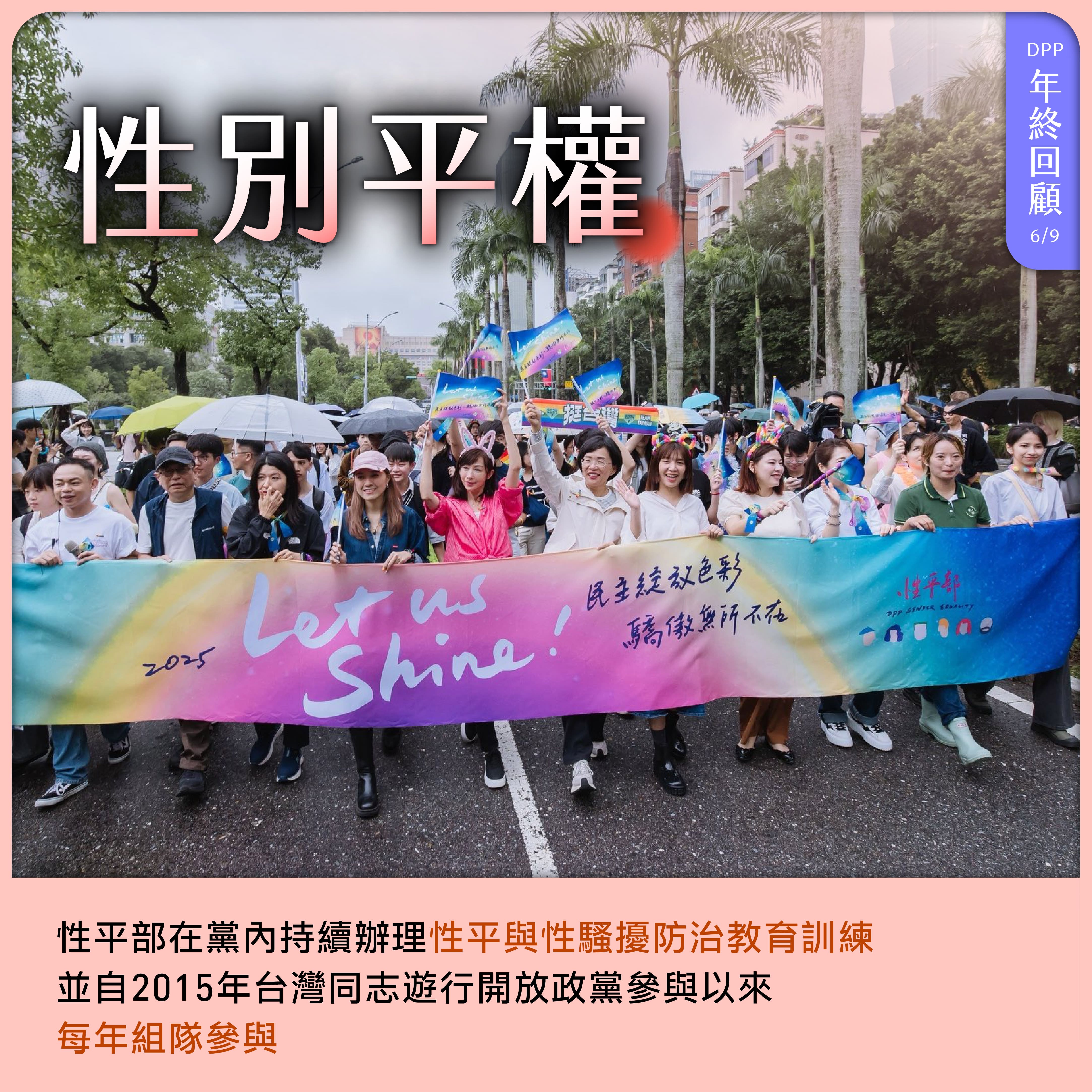 性平部在黨內持續辦理性平與性騷擾防治教育訓練,並自2015年台灣同志遊行開放政黨參與以來,每年組隊參與。