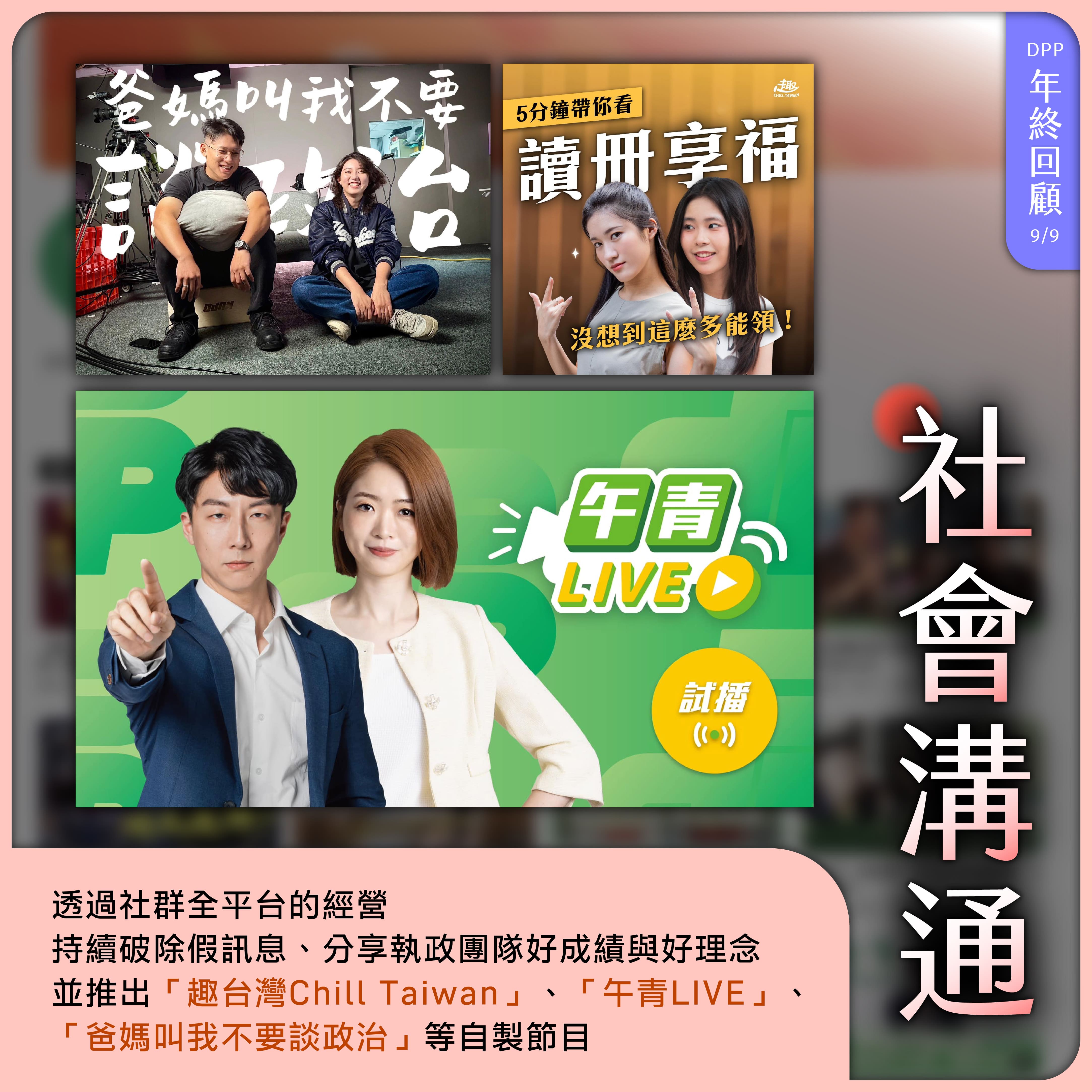 持續破除假訊息、分享執政團隊好成績與好理念,並推出 #趣台灣 Chill Taiwan、#午青LIVE、#爸媽叫我不要談政治 等自製節目。