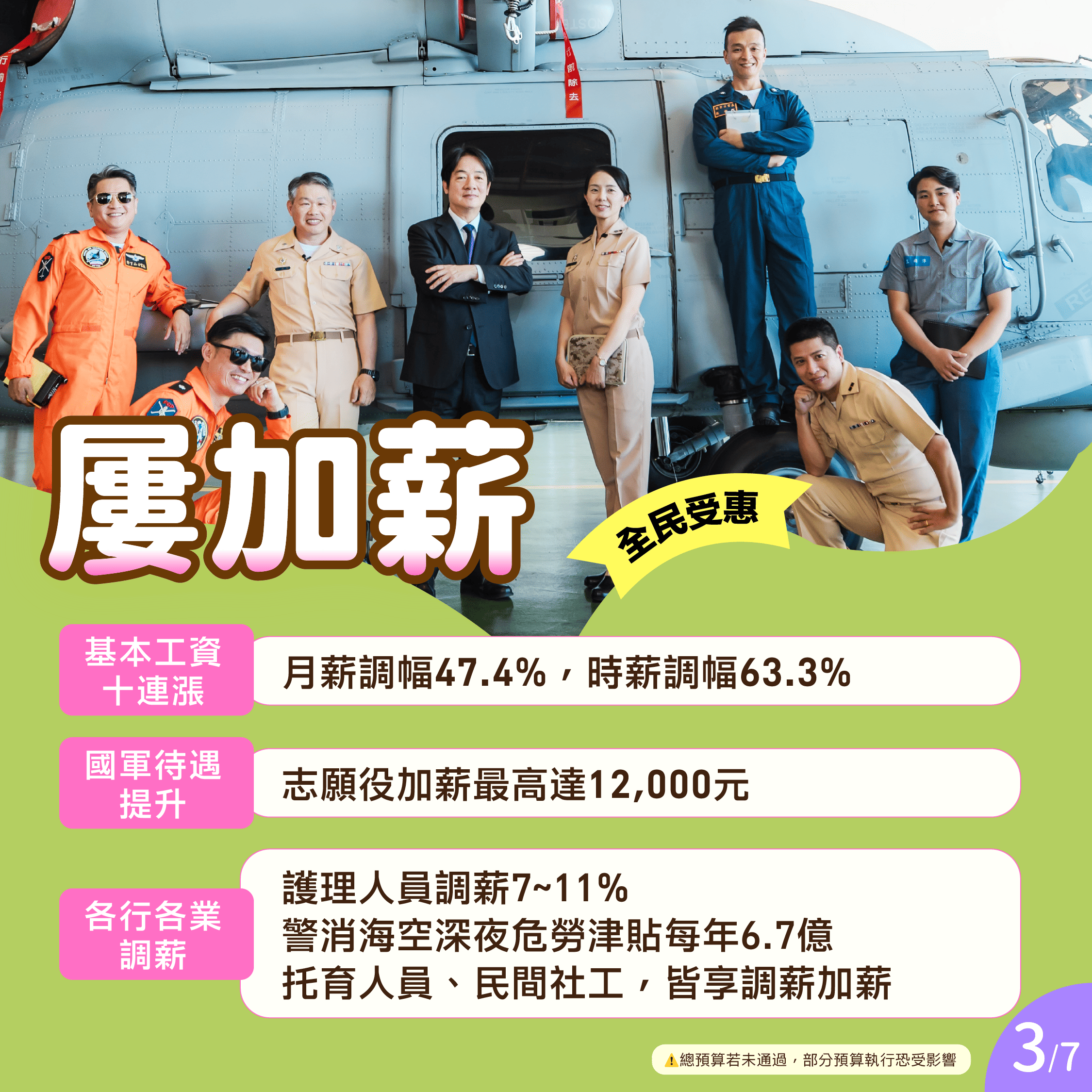 ・各行各業調薪!護理人員調薪7~11%、警消海空深夜危勞津貼每年6.7億,托育人員、民間社工,皆享調薪加薪。
