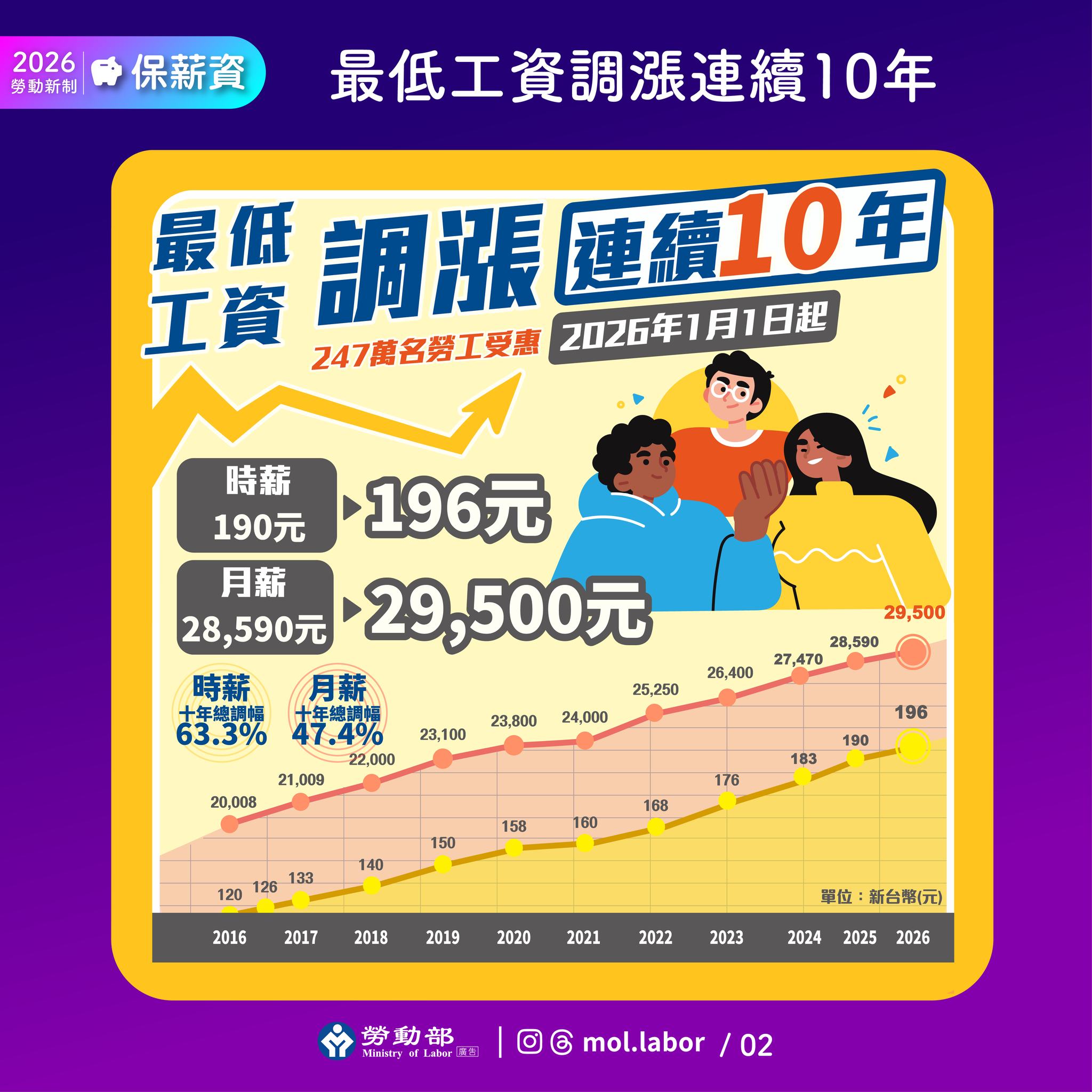 2026年起,最低月薪調升至 29,500元、時薪 196元,約247萬名勞工受惠,連續10年調升,就是要穩穩照顧最需要幫忙的基層勞工。(補充:共計208萬本國勞工受惠!)