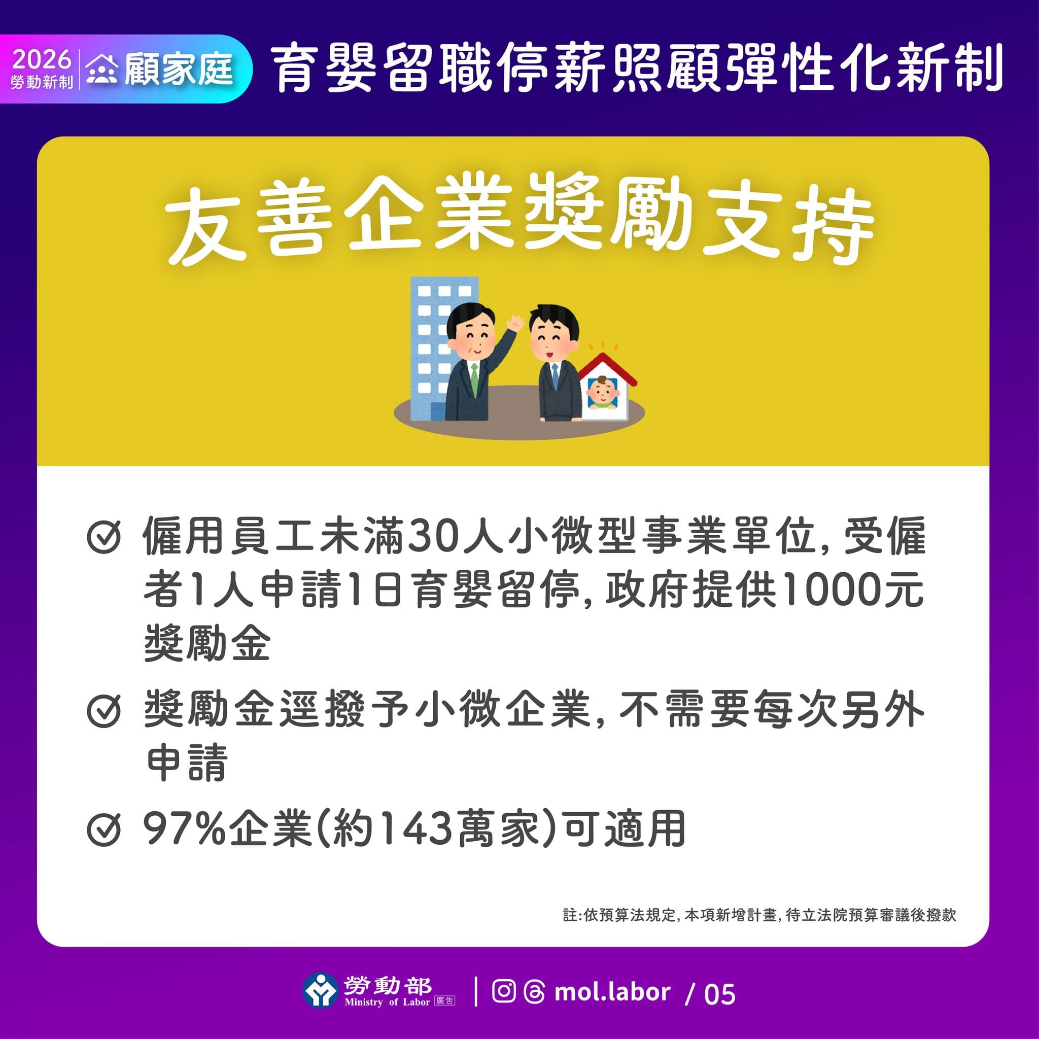 育嬰留停可「按日」請,雙親合計60天;家庭照顧假、照顧事由的事假可「按小時」請,雇主不得扣全勤。生育補助加碼,每胎最高合計 10萬元。