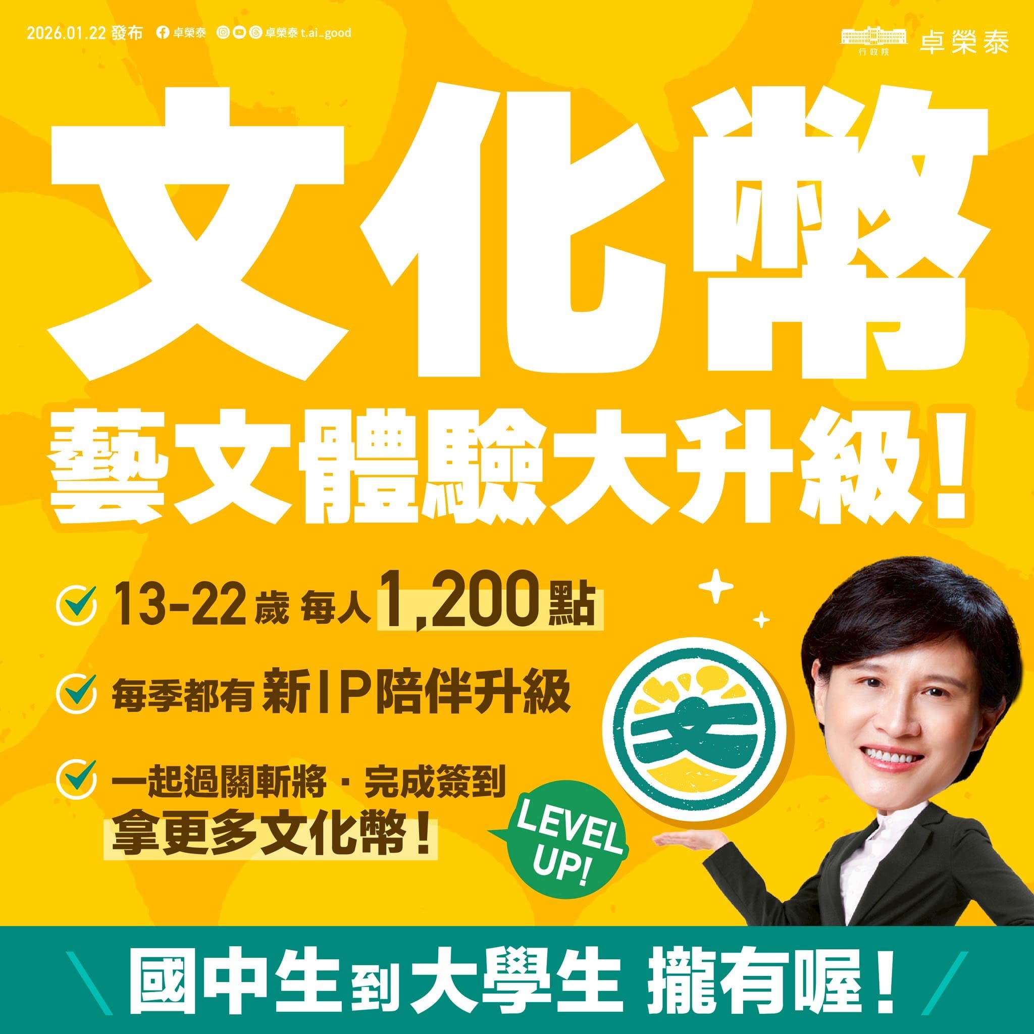 今年文化幣從1月1號起發放,19天就已超過 4成 青年朋友領取,約 81.4 萬人受惠。我也要鼓勵青年朋友,寒假期間可善用文化幣,探索多元文化,同時帶動本土文化產業發展。