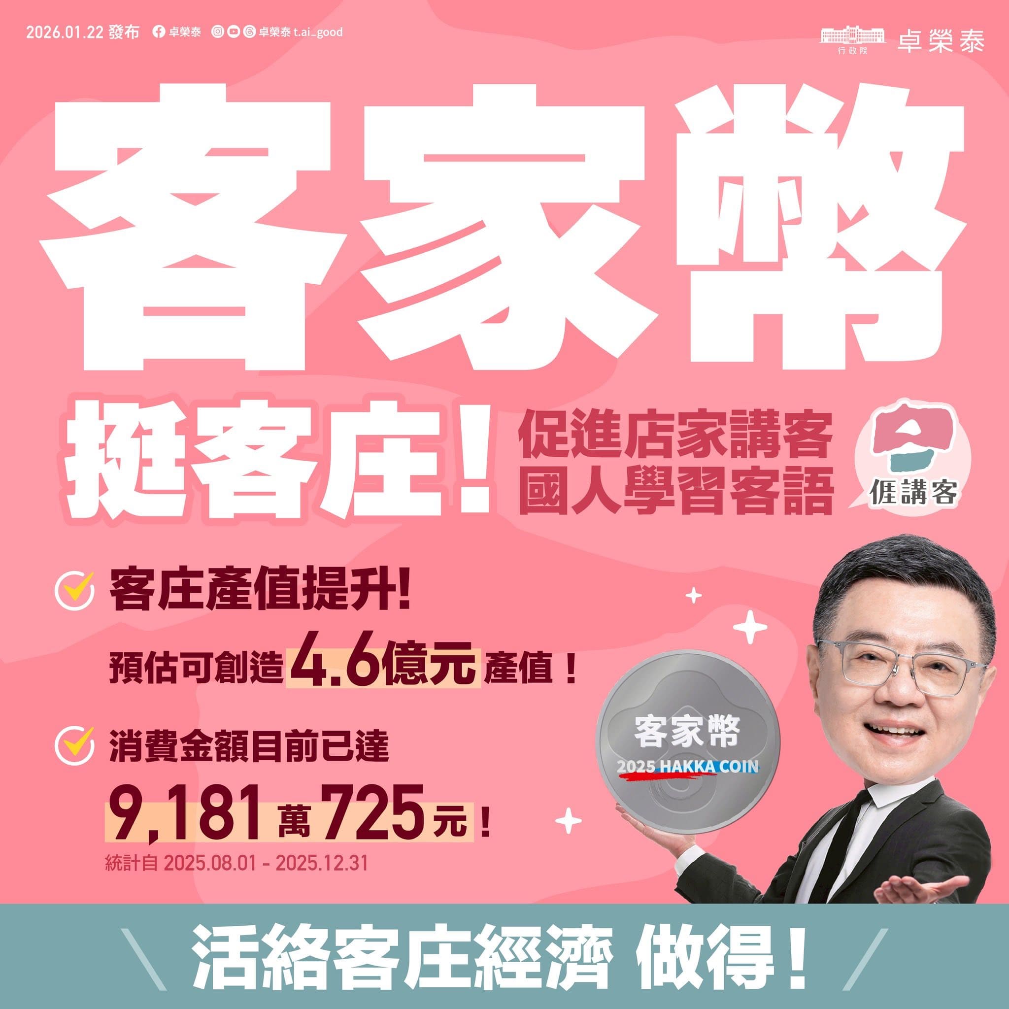 客家幣是總統 #客家六箭 的重要措施之一,鼓勵民眾走入客庄,體驗豐富的客家語言、文化和美食,營造實際的「講客生活圈」。