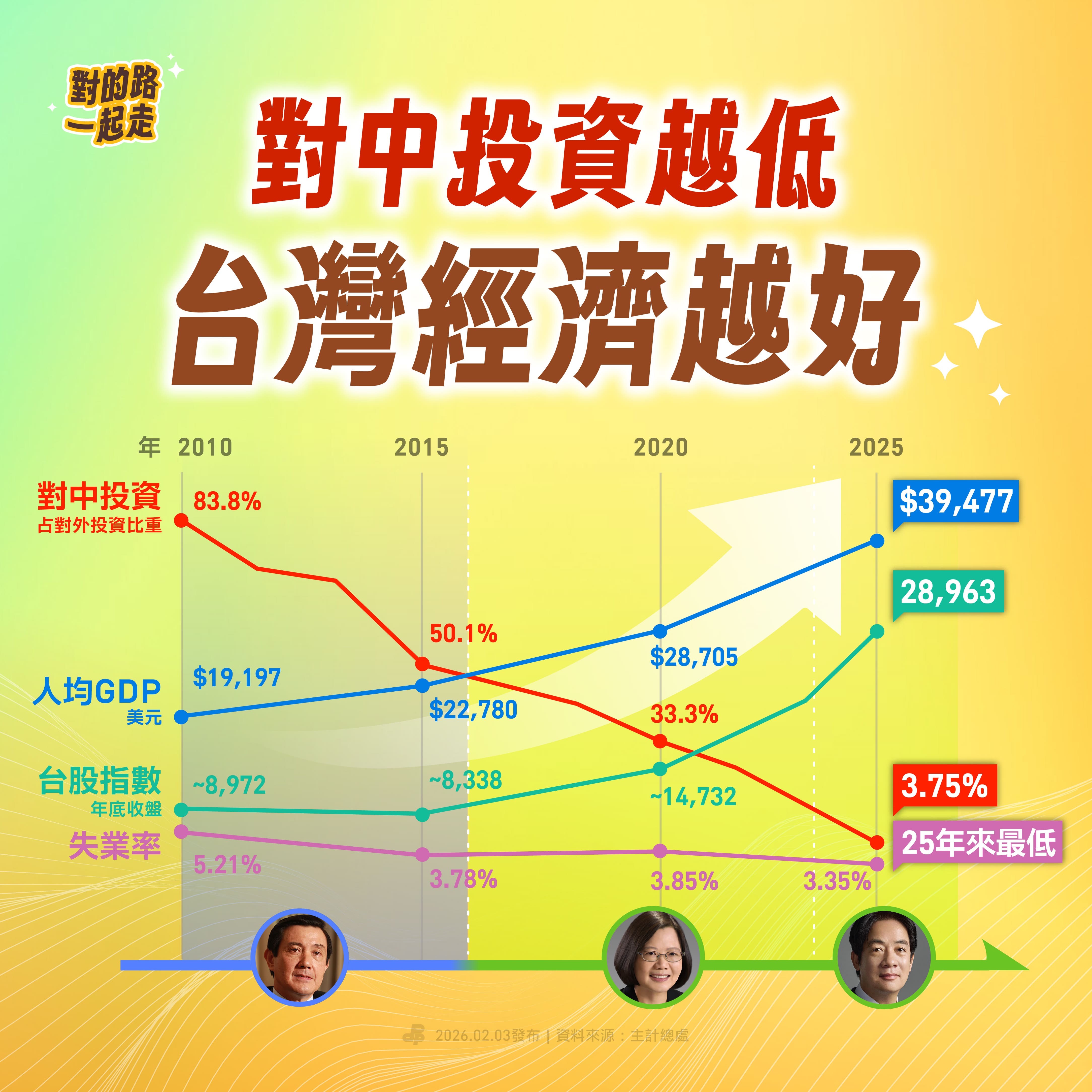 從這份2010年至2025年間的經濟圖表可以看出,台灣對中國投資占比,15年來從83.3%大幅降低至3.75%,各項經濟表現則明顯攀升: