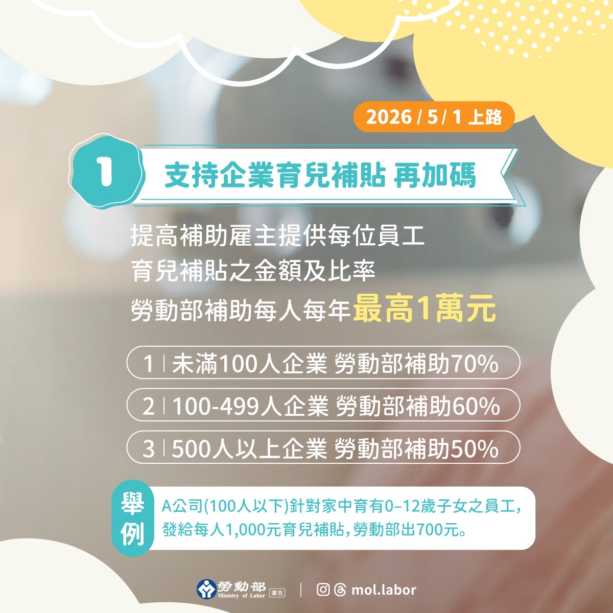 ➊ 育兒補貼再加碼:每人每年最高補助1萬元,未滿百人小公司補助比率高達70%