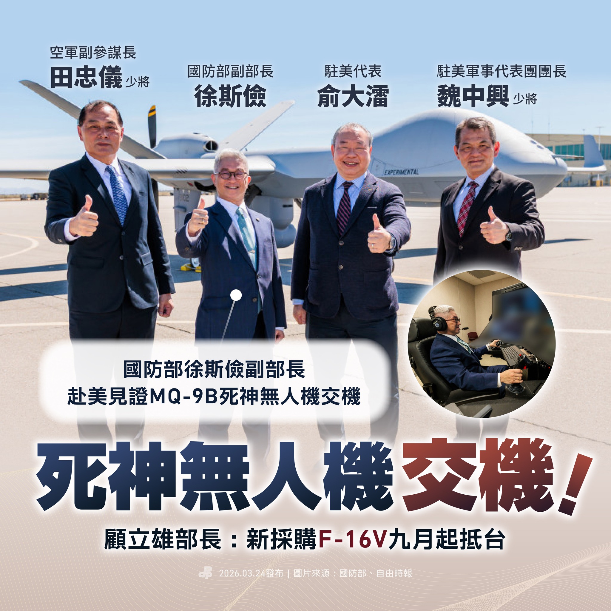軍購持續出貨中!國防部副部長 #徐斯儉 率團前往美國,在駐美代表俞大㵢陪同下,出席中華民國空軍「MQ-9B高高空無人機」(又稱 #死神無人機)首批2架交機典禮。