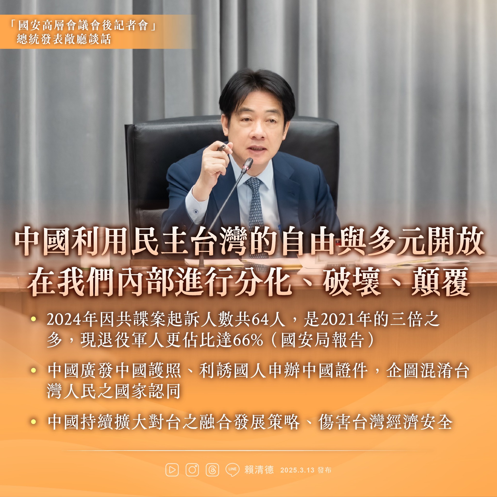 今年才剛開始,已經發生多項滲透、統戰的國安議題。今天,我在總統府召開國安高層會議,針對各主要類型統戰威脅,提出對應五大國安及統戰威脅以及十七大項的因應策略,希望整合各部會力量,以積極作為、採取相應防範措施,確保國家主權不受侵害,確保兩千三百萬人民的自由民主和生活方式永續如常。
