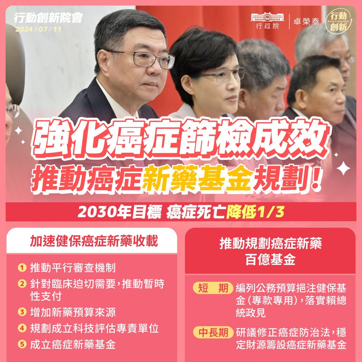 衛福部院會報告「提升癌症新藥可及性暨百億癌症新藥基金規劃」。明年,政府將癌症篩檢預算從28億增加到68億元,也擴大篩檢對象年齡與服務!另外為了減輕病友負擔,政府現階段先以公務預算挹注健保專款專用支應病友的需要,後續再逐步擴大癌症新藥基金至百億元規模,落實總統 賴清德 健康台灣政見。