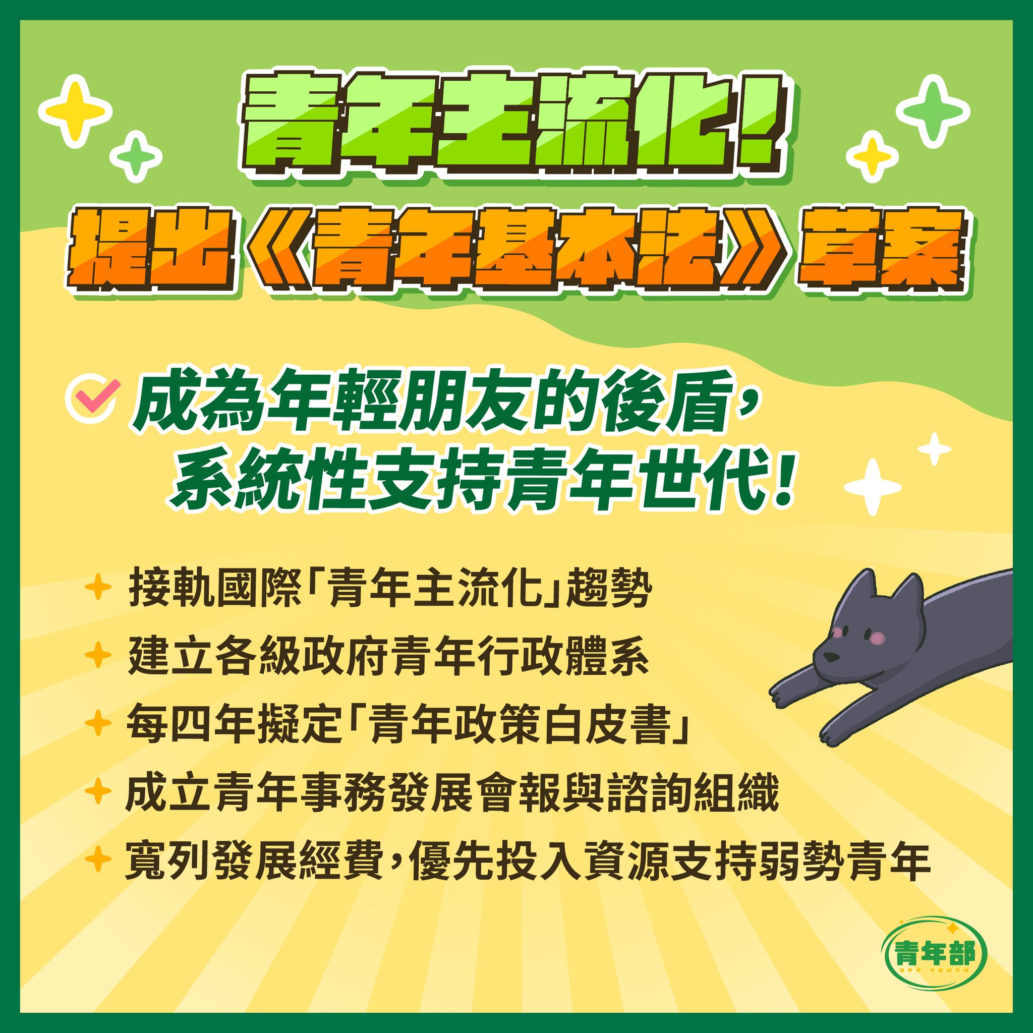今年,行政院也在「青年議題主流化」的方針下,提出「青年基本法」草案,未來將系統性地將青年視角、需求及權益納入政策中,也擴大青年朋友的參與。