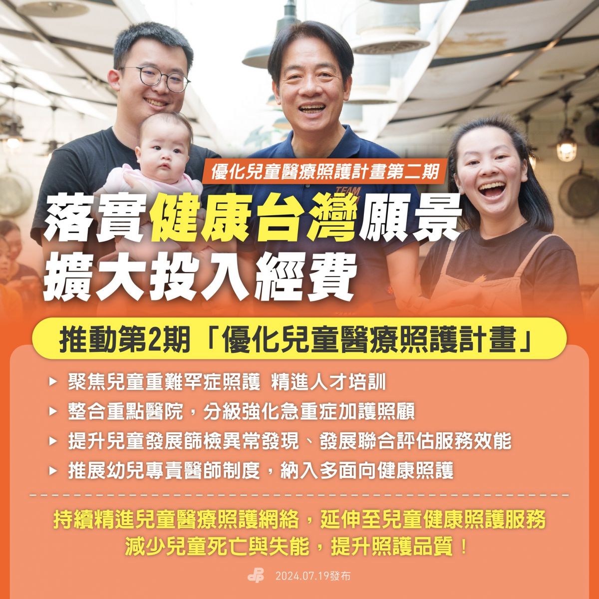 為維護新生兒及兒童的生命健康,政府將強化新生兒及兒童的整體醫療照護,提升兒童發展篩檢、初級照護及重難罕症照護,並加強醫事人才培訓,實現「健康台灣」願景!